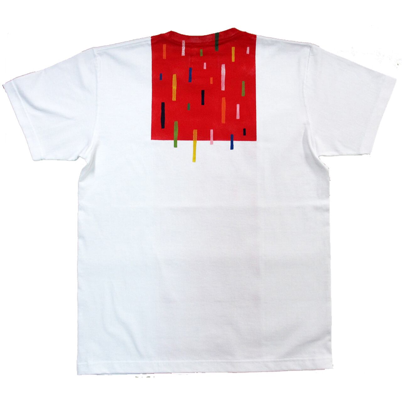 センターにレッドペイント カラフルなラインがランダムに入ったアートデザイン